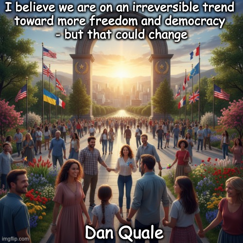 Image: Peter van Geest AI. Meaning: The statement “I believe we are on an irreversible trend toward more freedom and democracy, but that can change” suggests the following: Irreversible trend: The speaker believes the world is developing in a positive direction, with freedom and democracy becoming increasingly important. Caveat: There is a caveat that this development is not guaranteed and can be influenced by external factors or changes. Origin: The statement originated with Dan Quayle, an American politician who served as Vice President under President George H.W. Bush from 1989 to 1993. Quayle has spoken in various speeches and interviews on topics such as freedom, democracy, and the future of the world. Context:Political background: Quayle’s remarks are often made in the context of the post-war world order, in which many countries transitioned to democratic governments. Era: The statement can also be placed in an era of major changes, such as the fall of the Berlin Wall and the rise of democratic movements in various parts of the world. Conclusion: Dan Quayle’s statement reflects an optimistic, yet cautious, perspective on the development of freedom and democracy worldwide. It emphasizes the need to remain vigilant for changes that could affect this trend.