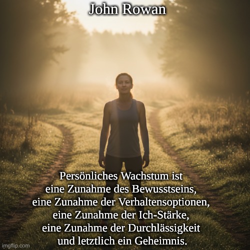 Autor: John Rowan (1935–2018) war ein einflussreicher Psychologe der humanistischen und transpersonalen Psychologie. Bekannt für Werke wie „Ordinary Ecstasy“ und „The Transpersonal“. Die Aussage wird oft Carl Gustav Jung zugeschrieben, doch findet sich in Jungs Gesammelten Werken oder Briefen keine verifizierbare Quelle. Der plausibelste und am besten nachvollziehbare Autor ist John Rowan (humanistischer/transpersonaler Psychologe). 🧭 Ursprung/Quelle: Das Zitat kursiert international in (übersetzter) Form. Die englische Kurzfassung lautet oft: „Persönliches Wachstum ist eine Steigerung des Bewusstseins, eine Zunahme der Verhaltensmöglichkeiten, eine Steigerung der Ich-Stärke, eine Steigerung der Durchlässigkeit und letztendlich ein Mysterium.“ Höchstwahrscheinlich aus „Ordinary Ecstasy“ (verschiedene Ausgaben).