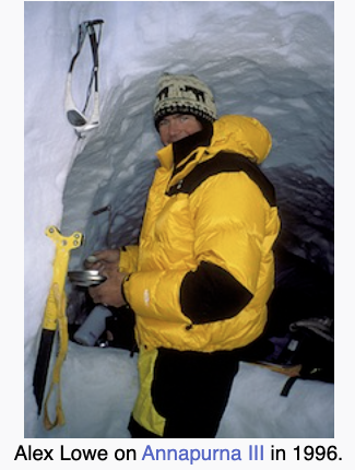 American mountaineer. He has been described as inspiring “…a whole generation of climbers and explorers with his uncontainable enthusiasm, legendary training routines, and significant ascents of rock climbs, ice climbs, and mountains all over the world…”. He died in an avalanche on Shishapangma, in Tibet. The Alex Lowe Charitable Foundation honors his legacy.