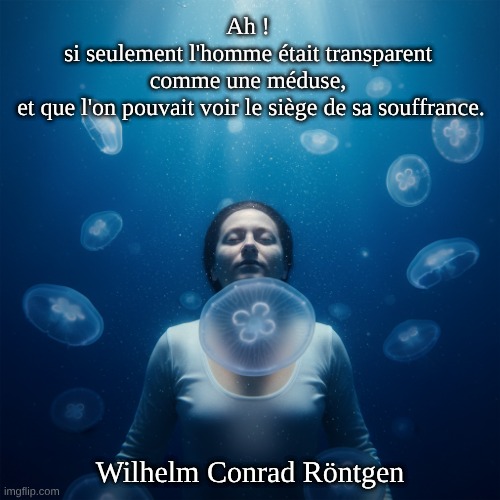 Image: Peter van Geest AI. 🧠 Signification : Cette citation utilise la méduse (un animal transparent) comme métaphore du souhait que les gens soient « transparents », non pas au sens propre, mais au sens émotionnel et intérieur. Idée clé : Si la douleur intérieure d’une personne était visible, nous pourrions en reconnaître la source et lui offrir une meilleure compréhension, plus d’empathie et une aide plus efficace. 💛 🕵️ Origine : Aucune source fiable et documentée (livre, conférence, lettre, article de journal) ne recense cette citation sous cette forme.Elle apparaît principalement dans des contextes en ligne récents (citations, bannières, réseaux sociaux), sans provenance ni datation vérifiables. Conclusion : Il s’agit probablement d’un aphorisme internet moderne et anonyme, sans origine établie dans une source classique ou académique. ✍️ Auteur :Souvent attribuée à tort à Wilhelm Conrad Röntgen. Source non primaire : Cette citation est introuvable dans les publications, conférences ou la correspondance de Röntgen. Mécanisme d’attribution erronée : Le thème de la « transparence » correspond à la découverte des rayons X par Röntgen, ce qui permet d’associer facilement (mais incorrectement) la citation à lui en ligne. 🩻