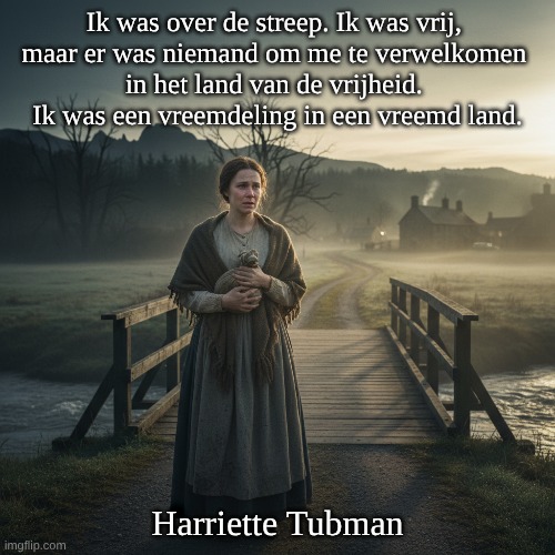 “Een vreemdeling in een vreemd land” benadrukt dat je, zelfs in vrijheid, nog ontheemd kunt zijn: onbekende plek, geen netwerk, geen veiligheid/vertrouwdheid. 🧭 Oorsprong: 1) Harriet Tubman-context (historische oorsprong) Dit citaat is (in het Engels) bekend als een passage die wordt toegeschreven aan Harriet Tubman in het verhaal over haar eerste ontsnapping uit slavernij naar het noorden (Verenigde Staten). Een veelgeciteerde Engelse vorm is (licht variërend per bron/uitgave): “I was free, but there was no one to welcome me to the land of freedom. I was a stranger in a strange land.” Deze woorden komen naar voren in de 19e-eeuwse biografische literatuur over Tubman. 2) Bijbelse echo in de formulering: De frase “a stranger in a strange land” is ook een duidelijke bijbelse verwijzing (KJV) naar Exodus 2:22: “for he said, I have been a stranger in a strange land.” Dit betekent: Tubmans (toegeschreven) uitspraak resoneert met een bekende religieuze formulering over ballingschap/ontheemding. 👤 Auteur / bron: ✅ Toeschrijving: Toegeschreven aan: Harriet Tubman. 📚 Waar is het opgeschreven? De passage wordt doorgaans gelinkt aan Sarah H. Bradford, die Tubmans leven beschreef in: Scenes in the Life of Harriet Tubman (1869) (Bradford publiceerde later ook een vervolg/aanvullende uitgave.) ⚠️ Nuancering over “auteur”: Tubman heeft deze woorden niet zelf als exact citaat gepubliceerd; ze zijn via Bradford overgeleverd (biografisch/vertellend). Daardoor bestaat er variatie in exacte bewoordingen en vertalingen. De Nederlandse tekst die jij citeert (“Ik was over de streep…”) is zeer waarschijnlijk een vertaling/parafrase van die bekende Engelse passage.