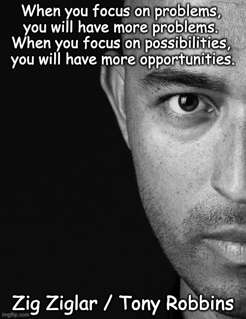 Photo: Joel Muniz. Meaning📌 💡:Attention directs your experience and behavior: what you mentally focus on influences what you notice (selective attention), how you interpret situations, and what actions you take (or don’t take). Problem-focus vs. solution-focus: With problem-focus, you’re more likely to worry, see risks, and experience blockages. With possibility-focus, you’re more likely to explore options, experiment, seek help, and therefore create opportunities. Important nuance: the saying doesn’t mean “ignore problems,” but rather: don’t get stuck in the problem frame—shift to possibilities/actions.🔍 Origin: This type of statement comes from the motivational speaking/self-help tradition (20th century), where “mindset,” “attitude,” and “focus” are central. It aligns with well-known psychological principles such as: selective attention (you see more of what you’re looking for), confirmation bias (your brain is more likely to confirm your expectations), and self-fulfilling prophecy (expectation → behavior → outcome). However: a clear ‘first source’ (such as a specific book + page number) is difficult to substantiate for this specific quote. 👤 Author: The quote is very often attributed to “Zig Ziglar” Zig Ziglar = Hilary Hinton “Zig” Ziglar (1926–2012), American sales trainer and motivational speaker. Tony Robbins, American motivational speaker, is also mentioned in this context, but for neither of them can 100% be said with certainty. ⚠️ Not watertight (quotes circulating online often lack a primary source)