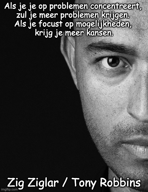Belangrijke nuance: het gezegde betekent niet “negeer problemen”, maar eerder: blijf niet hangen in het probleemframe—verschuif naar mogelijkheden/acties. 🔍 Oorsprong: Dit type uitspraak komt uit de motivational speaking / self-help traditie (20e eeuw), waar “mindset”, “attitude” en “focus” centraal staan. Inhoudelijk sluit het aan bij bekende psychologie-principes zoals: selectieve aandacht (je ziet meer van wat je zoekt), confirmation bias (je brein bevestigt sneller je verwachting), zelfvervullende voorspelling (verwachting → gedrag → uitkomst). Maar: een eenduidige ‘eerste bron’ (zoals een specifiek boek + paginanummer) is bij dit specifieke citaat moeilijk hard te maken. 👤 Auteur: De quote wordt heel vaak toegeschreven aan “Zig Ziglar” Zig Ziglar = Hilary Hinton “Zig” Ziglar (1926–2012), Amerikaanse verkooptrainer en motivational speaker. Ook Tony Robbins, Amerikaanse motivatiespreker, wordt in dit verband genoemd, voor geen van beiden is er 100% zekerheid te geven. ⚠️ Niet waterdicht (online circulerende citaten zijn vaak zonder primaire bron)