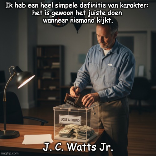 Afbeelding: Peter van Geest AI. Betekenis 🧠 🧭:Karakter = het juiste doen zonder toezicht: als niemand je ziet; als je er geen krediet voor krijgt; als je ermee weg zou kunnen komen. De vervolgzinnen maken het extra scherp: hij bekritiseert een cultuur waarin mensen denken: “het enige juiste is wegkomen ermee”, “het enige foute is gepakt worden” ⚖️, hij zet daar een morele norm tegenover: juist handelen, óók zonder externe controle. 🧬 Oorsprong: idee vs. formulering 🏛️: 1) Het idee is veel ouder. De gedachte “goed doen zonder dat iemand kijkt” is klassiek in moraalfilosofie en religieuze ethiek (deugd, plicht, oprechtheid). 2) De formulering in dit citaat is goed te dateren. De specifieke zin zoals hier beschreven is aantoonbaar uitgesproken door J.C. Watts (1996) via het CNN-transcript. ✅👤 Auteur🎙️: Spreker/auteur: J.C. Watts Jr. (toen: U.S. Representative, Oklahoma). Waar: Republican National Convention, San Diego. Wanneer: 13 augustus 1996.Bronsoort: primair (toespraaktranscript) ✅. 🔁 Relatie met de bekende “integrity”-quote (EN & NL) 🔎 Veel gedeelde variant (Engels): “Integrity is doing the right thing, even when no one is watching.”Nederlandse parafrase: “Doe het juiste, zelfs als niemand kijkt. Integriteit wordt dat genoemd.” Belangrijk verschil 📌: Watts spreekt over character (karakter), niet letterlijk over integrity (integriteit). De “integrity”-zin is inhoudelijk een parafrase/variant die later enorm populair is geworden (trainingen, posters, internet). Die variant wordt vaak aan o.a. C.S. Lewis toegeschreven, maar dat is regelmatig bron-onzeker (vaak zonder verifieerbare primaire vindplaats). ⚠️ Watts (1996) is dus de beste harde bron voor deze gedachte in precies deze stijl. 🇳🇱 Goede Nederlandse vertaling van Watts’ quote ✍️ Aanbevolen vertaling (dicht bij het Engels): “Ik heb een heel simpele definitie van karakter: het is gewoon het juiste doen wanneer niemand kijkt.” Vrijere versie (meer spreektaal): “Je karakter blijkt als niemand kijkt: doe je dan nog steeds wat juist is?”