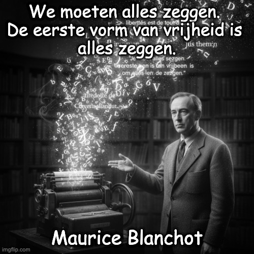 Afbeelding: Peter van Geest AI. Betekenis 🗣️: De kern van dit gezegde ligt in het benadrukken van de absolute noodzaak van vrije expressie. Het stelt dat: Alles gezegd moet kunnen worden: Er mogen geen taboes of verboden onderwerpen zijn als het gaat om meningsuiting. Dit impliceert een open dialoog waar alle gedachten, ideeën, kritiek en zelfs controversiële standpunten welkom zijn. Vrijheid van spreken is fundamenteel: Het is niet zomaar één van de vrijheden, maar “de eerste” of de meest essentiële. Zonder de vrijheid om je uit te drukken, zijn andere vrijheden (zoals van gedachte, vergadering, etc.) beperkt of zelfs zinloos. Het is de basis waarop een open samenleving rust. Invloed op waarheid en vooruitgang: Alleen wanneer alles gezegd kan worden, kan de waarheid naar boven komen, kunnen misstanden worden aangekaart en kan een samenleving zich ontwikkelen en verbeteren. Oorsprong en Auteur: Maurice Blanchot ✒️. Maurice Blanchot (1907-2003) was een invloedrijke Franse literair theoreticus, filosoof en schrijver. Zijn werk bewoog zich vaak op het snijvlak van literatuur, filosofie en politiek, en hij was een belangrijke figuur in het postmodernisme. De specifieke formulering die je noemt, komt uit zijn essay “La Littérature et le Droit à la Mort” (Literatuur en het recht op de dood) uit 1948. In dit essay onderzoekt Blanchot de relatie tussen taal, literatuur en het menselijk bestaan, en raakt hij aan fundamentele vragen over vrijheid en uitdrukking. De context waarin hij deze uitspraak doet, benadrukt de radicale en soms gevaarlijke aard van de literatuur en het schrijven, dat geen grenzen kent en zelfs de dood niet schuwt in zijn zoektocht naar absolute expressie. Hij pleit voor een totale vrijheid van spreken, zelfs als dat pijnlijk of confronterend is. Kortom, het is een krachtige uitspraak die het belang van onbeperkte expressie in het hart van de menselijke vrijheid plaatst, en die perfect past bij het gedachtegoed van een denker als Maurice Blanchot.