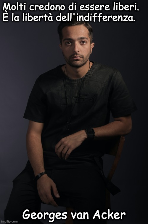 Foto: Hadi Yazdi. Significato 📚: Questa citazione tocca profonde idee filosofiche sulla libertà e la condizione umana. Il punto centrale è che ciò che molti percepiscono come libertà potrebbe in realtà essere una forma di indifferenza. Analizziamola: Libertà: Tradizionalmente associata all’autonomia, la capacità di fare scelte e agire senza coercizione. Indifferenza: Implica una mancanza di interesse, coinvolgimento o cura. Quando i due concetti sono combinati, la citazione suggerisce che le persone si sentono libere perché non si preoccupano di determinate questioni, non si trovano di fronte a scelte difficili o forse non prevedono nemmeno le implicazioni delle loro azioni. È una “libertà da”: essere liberi dalla responsabilità, liberi dalla profondità, liberi da un coinvolgimento autentico. Questo tipo di libertà può essere superficiale e può mascherare una più profonda mancanza di vera autonomia o di pensiero critico. Può anche riferirsi alla libertà che deriva dal non essere consapevoli delle catene che si portano, o dal non vedere la necessità di agire o prendere posizione. 🌍 Origine e autore: La citazione è spesso attribuita a Georges van Acker. Georges van Acker (1940–2022) è stato un filosofo, psicoanalista e scrittore belga. Era noto per le sue approfondite analisi della psiche umana, della società e della filosofia, spesso da una prospettiva lacaniana. Il suo lavoro trattava frequentemente temi come il desiderio, la soggettività, il potere e, in effetti, la libertà. Contesto della citazione: Questa citazione si inserisce bene nel pensiero di Van Acker, che ha analizzato criticamente la società moderna e il modo in cui gli individui si posizionano al suo interno. Sosteneva che la vera libertà è spesso accompagnata da consapevolezza, responsabilità e dalla volontà di affrontare questioni complesse, piuttosto che rifugiarsi nell’indifferenza o nella passività. La “libertà dell’indifferenza” non è quindi vera libertà, ma piuttosto un’illusione o una forma mascherata di impotenza.