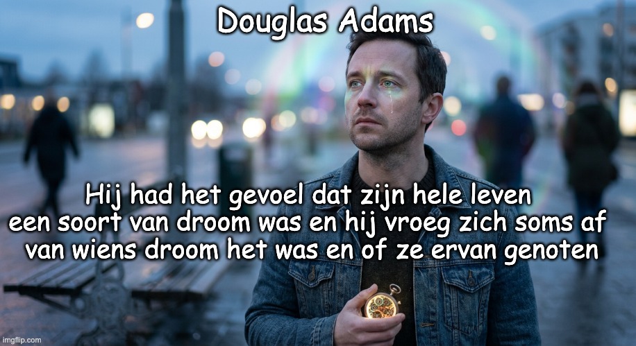 Afbeelding: Peter van Geest.💡 Betekenis: Dit aangrijpende citaat duikt diep in existentiële thema’s en beschrijft gevoelens die vaak worden ervaren tijdens periodes van diepe zelfreflectie of vervreemding. Het kan op verschillende manieren worden geïnterpreteerd: Existentiële afstandelijkheid en dissociatie: Het kerngevoel is dat van een observer in plaats van een deelnemer aan het eigen leven. De protagonist (en misschien ook de lezer) ervaart de realiteit als surrealistisch en onsamenhangend, net als een droom. De Matrix/Simulatietheorie: Letterlijker genomen (vooral binnen de context van het bronmateriaal), onderzoekt het de gedachte dat het hele universum van de protagonist een kunstmatige constructie zou kunnen zijn – een simulatie of een droom die toebehoort aan een machtige, misschien onverschillige, entiteit. Een betekeniscrisis: Als het leven niet ‘echt’ is in de conventionele zin, maar eerder een manifestatie van iemands bewustzijn, dan worden de betekenis en het doel van individuele acties en keuzes in twijfel getrokken. Het benadrukt een zoektocht naar authenticiteit in een schijnbaar onauthentiek bestaan. Vragen over de ‘Dromer’: Het tweede deel van het citaat (“van wie het was en of ze ervan genoten”) verschuift de focus van de droomervaring naar de aard van de entiteit die ervoor verantwoordelijk is. Het roept de vraag op of de ‘dromer’ (schepper, god of beheerder van de simulatie) voldoening of amusement ontleent aan het lijden en de worstelingen van de personages in de droom. 📜 Oorsprong: Bron: Deze zin is afkomstig uit de roman “So Long, and Thanks for All the Fish”. Over het boek: Dit boek, gepubliceerd in 1984, is het vierde deel in de ’trilogie’ “The Hitchhiker’s Guide to the Galaxy” (die uiteindelijk vijf of zes boeken omvatte, afhankelijk van hoe je telt). Context:  Het citaat beschrijft de gemoedstoestand van de protagonist, Arthur Dent, bij zijn terugkeer naar de aarde. Na jarenlang door de bizarre en gevaarlijke Melkweg te hebben gereisd (en de Aarde meerdere keren te hebben zien verwoesten), keert hij terug naar een ogenschijnlijk normale Aarde – waar niemand zich de apocalyps herinnert – waardoor hij zijn realiteit en zijn eigen geestelijke gezondheid in twijfel trekt. ✍️ Auteur: Deze iconische zin is geschreven door de briljante en geliefde Engelse auteur Douglas Adams (1952-2001).Literaire impact: Adams staat bekend om zijn mix van surrealistische komedie, sciencefiction, filosofie en scherpe maatschappijkritiek. “The Hitchhiker’s Guide to the Galaxy” begon als een BBC-radioserie en groeide uit tot een wereldwijd multimediafenomeen. Adams’ stijl: Het citaat is een perfect voorbeeld van zijn vermogen om diepe existentiële angst en fundamentele filosofische vragen op te roepen, om deze vervolgens direct te ondermijnen met wrange humor of absurditeit (de vraag of de maker wel van de droom geniet).