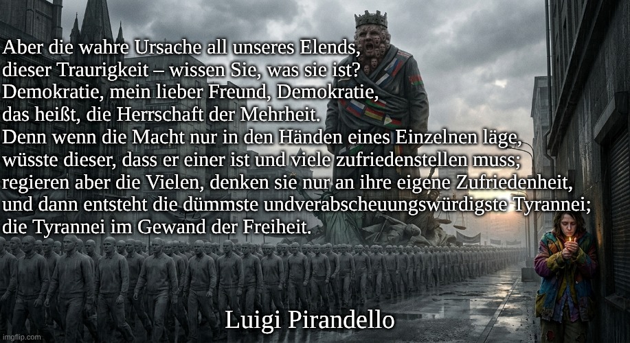 Bild: Peter van Geest AI. Bedeutung 📖 😊: Dieses Zitat ist eine scharfe Kritik an der Demokratie, oder zumindest an ihrer praktischen Umsetzung. Kernaussage: Der Sprecher argumentiert, dass die wahre Quelle von Elend und Leid nicht im Mangel an Freiheit liegt, sondern in der Demokratie selbst, definiert als „Herrschaft der Mehrheit“. Vergleich: Es wird ein Vergleich zwischen einer Ein-Personen-Regierung (einer Autokratie oder Monarchie) und einer Mehrheitsregierung angestellt. Das Individuum: Wenn eine Person die Macht innehat, ist sie sich ihrer Alleinherrschaft bewusst und muss die „Vielen“ (das Volk) zufriedenstellen, um ihre Position zu erhalten. Dies impliziert eine gewisse Verantwortung. Die Vielen (die Mehrheit): Wenn die Mehrheit regiert, geht man davon aus, dass diese Gruppe lediglich darauf bedacht ist, ihre eigenen Wünsche und Bedürfnisse zu befriedigen. Schlussfolgerung: Laut dem Sprecher ist das Ergebnis einer Mehrheitsregierung die „dümmste und hasserfüllteste Tyrannei“. Warum? Weil sie „Tyrannei im Gewand der Freiheit“ ist. Die Mehrheit kann die Minderheit unterdrücken und dies im Namen der Demokratie und des Volkswillens rechtfertigen. 🕵️♂️ Herkunft und Autor: Das Zitat stammt vom berühmten italienischen Schriftsteller Luigi Pirandello.Autor:Luigi Pirandello (1867–1936), italienischer Dramatiker, Romancier und Dichter. Er erhielt 1934 den Nobelpreis für Literatur. Herkunft: Diese Aussage stammt aus seinem Roman „Il fu Mattia Pascal“ (Der tote Mattia Pascal), erschienen 1904. Das Zitat stammt aus Kapitel X (mit dem Titel „Acquasantiere“). Es wird von der Figur Anselmo Paleari gesprochen. Paleari ist ein philosophisch veranlagter Charakter, in dessen Haus der Protagonist Mattia Pascal (unter dem Pseudonym Adriano Meis) in Rom ein Zimmer mietet. 💡 Kontext und Philosophie:Der Sprecher: Es ist wichtig zu beachten, dass das Zitat von einer Romanfigur (Paleari) stammt und nicht unbedingt Pirandellos persönliche Überzeugung widerspiegelt. Pirandellos Themen:Pirandellos Werk ist bekannt für die Auseinandersetzung mit Themen wie: – Die Fragmentierung der menschlichen Identität. – Die Subjektivität der Wahrheit. – Der Gegensatz zwischen Schein („der Maske“) und Sein („dem Leben“). – Die Relativität sozialer und politischer Konstrukte. Die Aussage im Kontext: Im Kontext des Romans und Pirandellos Philosophie kann diese Demokratiekritik als Ausdruck von Pessimismus gegenüber gesellschaftlichen Organisationen verstanden werden. Die Vorstellung, dass die Mehrheit eine Maske der Freiheit tragen kann, während sie die Minderheit unterdrückt, passt gut zu seiner allgemeinen Skepsis gegenüber der Gesellschaft und der absoluten Wahrheit.