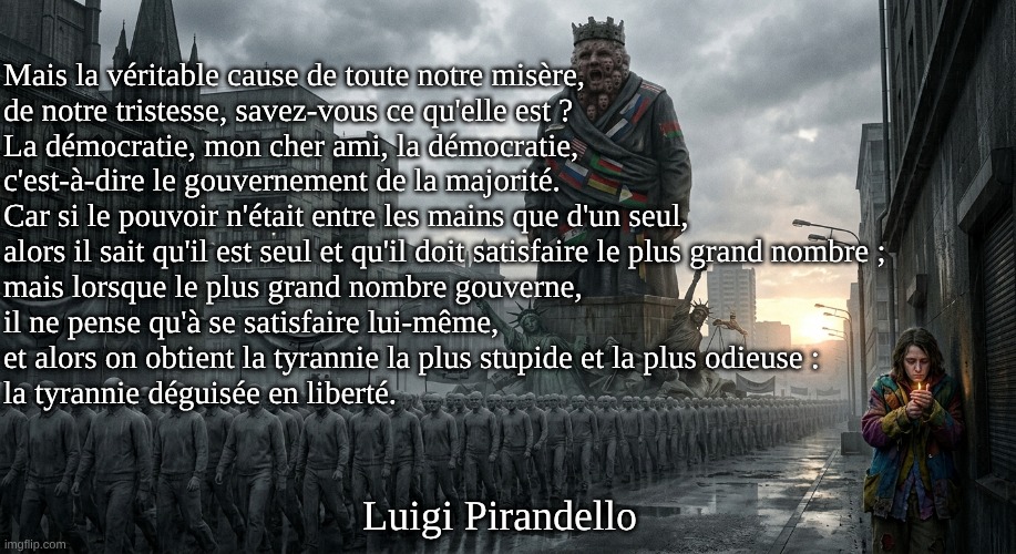 Image: Peter van Geest AI. Signification 📖 😊 :Cette citation est une critique acerbe de la démocratie, ou du moins de son application concrète. L’idée centrale : L’orateur soutient que la véritable source de misère et de souffrance n’est pas le manque de liberté, mais la démocratie elle-même, définie comme le « gouvernement de la majorité ». La comparaison : Une comparaison est établie entre un gouvernement exercé par une seule personne (une autocratie ou une monarchie) et un gouvernement majoritaire. L’individu : Lorsqu’une seule personne détient le pouvoir, elle est consciente de sa solitude et de la nécessité de satisfaire le peuple pour conserver son pouvoir. Cela implique une certaine responsabilité. La majorité : Lorsque la majorité gouverne, l’idée est que ce groupe ne se préoccupe que de satisfaire ses propres désirs et besoins. La conclusion : Selon l’orateur, le gouvernement majoritaire aboutit à la tyrannie la plus stupide et la plus odieuse. Pourquoi ? Parce qu’il s’agit d’une tyrannie déguisée en liberté. La majorité peut opprimer la minorité et justifier cette oppression au nom de la démocratie et de la volonté du peuple. 🕵️♂️ Origine et auteur : Cette citation est tirée du célèbre écrivain italien Luigi Pirandello.Auteur :Luigi Pirandello (1867-1936), dramaturge, romancier et poète italien. Il a reçu le prix Nobel de littérature en 1934. Origine : Cette citation est extraite de son roman « Il fu Mattia Pascal » (Le Mort Mattia Pascal), publié en 1904. Elle provient du chapitre X (« Acquasantiere ») et est prononcée par le personnage d’Anselmo Paleari. Paleari est un personnage à l’esprit quelque peu philosophique chez qui le protagoniste, Mattia Pascal (sous le pseudonyme d’Adriano Meis), loue une chambre à Rome. 💡 Contexte et philosophie : L’orateur : Il est important de rappeler que cette citation est prononcée par un personnage (Paleari) et ne reflète pas nécessairement la conviction personnelle et ferme de Pirandello lui-même. Thèmes de Pirandello :L’œuvre de Pirandello est connue pour son exploration de thèmes tels que : – La fragmentation de l’identité humaine. – La subjectivité de la vérité. – Le contraste entre l’apparence (« le masque ») et la réalité (« la vie »). – La relativité des constructions sociales et politiques. La citation dans son contexte : Dans le contexte du roman et de la philosophie de Pirandello, cette critique de la démocratie peut être perçue comme une expression de pessimisme à l’égard des organisations sociales. L’idée que « le plus grand nombre » puisse arborer un « masque » de liberté tout en exerçant une tyrannie sur une minorité s’inscrit dans son scepticisme général envers la société et la vérité « absolue ».