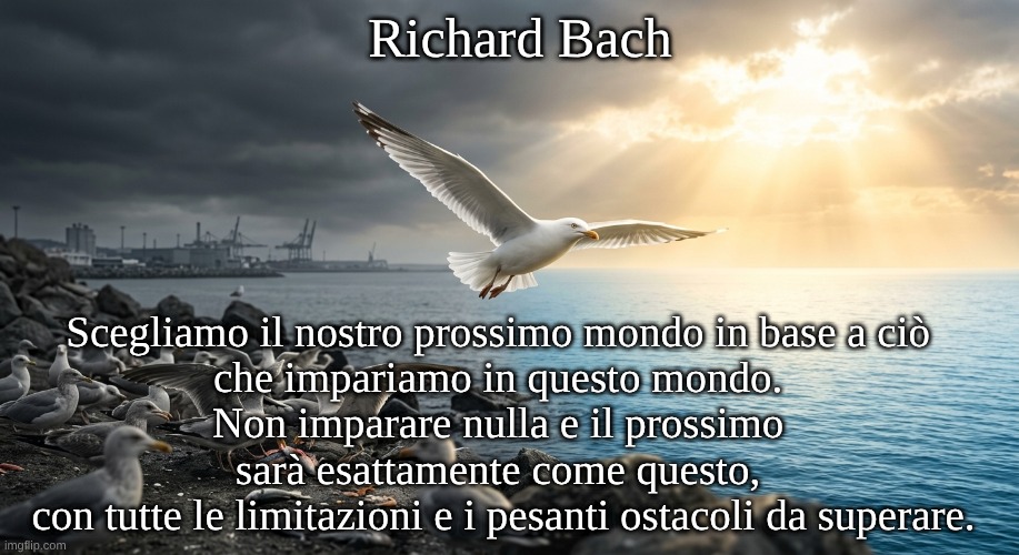 Immagine: Peter van Geest AI. Significato 🕊️: Questa citazione da “Jonathan Livingstone Seagull” porta un potente messaggio sulla “crescita personale”, sulla “coscienza” e sulle “conseguenze delle nostre azioni”.Analizziamo i diversi aspetti:Scegliere il nostro prossimo mondo: Metaforico: può simboleggiare una fase successiva della tua vita, una nuova situazione o anche un “prossimo mondo” in senso spirituale. Suggerisce che siamo noi stessi a influenzare la direzione che prendono le nostre vite. Scelta: la parola “scegliere” è essenziale qui. Sottolinea la nostra responsabilità e il fatto che non siamo vittime passive del destino. Le nostre scelte, basate su ciò che impariamo, modellano il nostro futuro. Apprendere come chiave per il cambiamento: processo attivo: imparare qui non significa semplicemente raccogliere fatti, ma un processo attivo di acquisire esperienze, commettere errori e imparare lezioni da essi. È un processo di crescita e trasformazione. Crescita ed evoluzione: quando impariamo, evolviamo come individui. Sviluppiamo nuove prospettive, competenze e intuizioni. Ciò ci consente di funzionare a un livello superiore nel “prossimo mondo”.Il pericolo di restare fermi (non imparare nulla): Ripetizione: la citazione avverte delle conseguenze del non imparare. Se continuiamo a ripetere i nostri errori e a non imparare dalle nostre esperienze, ci ritroveremo in una situazione simile, con gli stessi problemi e sfide. Limitazioni e ostacoli: gli “ostacoli pesanti” e le “limitazioni” simboleggiano le sfide che incontriamo sul nostro cammino. Se non impariamo a superarli, continueranno a perseguitarci. È come se continuassimo a girare in tondo senza fare alcun progresso. 📚 Origine: La citazione deriva dall’iconico racconto allegorico: Jonathan Livingstone Seagull (Titolo originale: Jonathan Livingston Seagull).Autore:Richard Bach.Anno di pubblicazione: La prima edizione è stata pubblicata nel 1970. Contesto: Il libro racconta la storia di un gabbiano, Jonathan, che è appassionato di volo e perfeziona la sua tecnica. Tuttavia, viene rifiutato dalla sua colonia perché non aderisce ai tradizionali schemi di volo e vuole solo catturare pesci per sopravvivere. Jonathan continua a viaggiare e impara da altri gabbiani che gli insegnano l’arte del volo trascendente. La citazione proviene da un passaggio in cui l’istruttore di Jonathan gli insegna le dimensioni spirituali del volo e della vita. 🖊️ L’Autore:Richard Bach è uno scrittore americano noto per i suoi temi filosofici e spirituali. Ha una passione per il volo e questa si riflette spesso nelle sue opere. Altre opere: Oltre a “Jonathan Livingstone Seagull”, Bach scrisse anche altri libri famosi, come “Illusions: The Adventures of a Reluctant Messiah” e “A Gift of Wings”. Stile: il suo stile di scrittura è spesso allegorico e intriso di idee spirituali e metafisiche. Esplora spesso la natura della realtà, il potere della mente e la ricerca della verità e della libertà. 💡 Conclusione e applicazione: questa citazione è più di una semplice affermazione filosofica. È un invito all’azione. Ci invita a essere consapevoli delle nostre esperienze e delle lezioni che possiamo imparare da esse. Ci incoraggia a continuare a imparare, crescere ed evolverci in modo da poter modellare il nostro futuro e creare una vita ricca di significato e realizzazione. Come puoi applicare questa citazione nella tua vita? Rifletti sulle tue esperienze: prenditi del tempo per pensare agli eventi della tua vita, sia positivi che negativi. Cosa hai imparato da ciò? Ponetevi delle domande: “Cosa posso imparare da questo?” e “Come posso utilizzare questa lezione per fare scelte migliori in futuro?” Rimani curioso: sii aperto a nuove idee ed esperienze. Impara nuove competenze, leggi libri, parla con persone provenienti da contesti diversi. Sii disposto a cambiare: sii aperto alla possibilità che potresti aver bisogno di modificare le tue convinzioni e il tuo comportamento. Assumersi la responsabilità: riconoscere che sei l’architetto della tua vita. Le tue scelte e azioni determinano il tuo futuro.