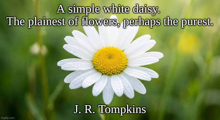Image: Peter van Geest AI. Meaning 🌼: The daisy (Leucanthemum vulgare) carries deep symbolism, often associated with the pure and the immaculate. Innocence in Purity: Due to its bright white petals, the flower symbol represents moral purity and childlike innocence. New Beginning: In many cultural contexts, the daisy marks the arrival of spring and, with it, a fresh start. Faithful Love: In the language of flowers (floriography), the daisy stands for “loyal love” and keeping a secret (“I will never tell”). Simplicity: The structure of the flower—a yellow heart with radiant white petals—is seen as the essence of natural beauty without embellishment. 🖋️Author: J.R. Tompkins. The quote “A simple white daisy. The simplest flower, perhaps the purest” is indeed effectively attributed to J.R. Tompkins (full name often noted as James Randall Tompkins). Tompkins is an author known for his life and poetic reflections on nature. Although he is not a famous classical author like Shakespeare, his words are written and quoted in modern literature and on artistic platforms. Basic principles of all text: All details are listed in the list below. By labeling the Daisy as “the purest”, the reader is encouraged to let go of the world and return to the basics. 🌱 Origin and Etymology: The daisy has both a biological and a linguistic origin of interest: 1.Naming: The word “Daisy” derives from the Greek ´margaritēs´, meaning “pearl”. 2.English name (Daisy): The English name ‘Daisy’ is derived from the Old English term ´dæges eage´, meaning “eye of the day”. Let’s say the name of the Flower is open to the sunrise and then to the sunset. 3.Botanical: The daisy belongs to the ‘Asteraceae’ family. It is a strong perennial plant that can grow in the wild almost anywhere in the world, which reinforces its image of modest strength. ✨ Why this flower is so disruptive:The reason Tompkins’ text resonates so strongly is the headache the daisy offers to an often busy and chaotic world:Minimalism: It proves that beauty does not need a thousand colors or complex forms. Accessibility: Unlike all the rare orchids of the fragile rose, the daisy is for everyone. They grow on the roadside and in the field. Honesty: What you see is what you get; a heart of gold and a wreath of light. ☀️
