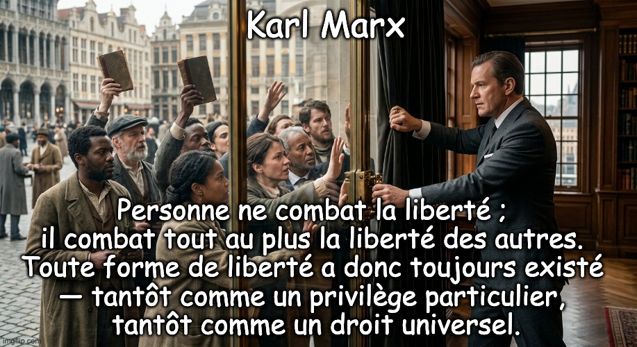 Image: Peter van Geest AI. Signification 📝 🕵️♂️ : Cette citation contient une observation pertinente sur la nature des luttes politiques et sociales. Voici les points clés de l’analyse : Le désir universel de liberté ✨ : La première phrase affirme que personne n’est fondamentalement opposé au concept de liberté. Chaque être humain aspire à l’autonomie et à la capacité de faire ses propres choix. Le conflit autour de la liberté ⚔️ : Ce conflit ne naît pas de la haine de la liberté, mais du fait que la liberté des uns implique souvent la restriction de celle des autres. Lorsqu’une personne semble lutter « contre la liberté », elle lutte en réalité pour préserver ou étendre sa propre liberté, au détriment de celle d’un autre groupe. Exemple : Un propriétaire d’esclaves ne lutte pas contre l’idée abstraite de liberté ; il lutte pour préserver sa propre liberté (de posséder des biens et d’agir), ce qui nie directement la liberté de la personne réduite en esclavage. L’évolution historique de la liberté ⏳ :La deuxième phrase décrit comment la liberté a été définie au cours de l’histoire : Comme un privilège 👑 : Dans de nombreuses sociétés historiques (comme le féodalisme ou les systèmes esclavagistes), la liberté était un bien exclusif, réservé à une petite élite (noblesse, propriétaires terriens). Leur liberté reposait sur la privation de liberté de la majorité. Comme un droit universel 🌍 : Avec l’avènement des Lumières et des démocraties modernes, l’idée a émergé que la liberté est un droit fondamental appartenant à tous, quel que soit leur statut. Le message central 🎯 : Cette citation souligne que la lutte pour la liberté est souvent une lutte pour sa distribution et sa définition. Le passage d’une liberté conçue comme un privilège à une liberté conçue comme un droit universel est le mouvement central de l’histoire moderne. 🏛️ Origine et auteur : Cette citation est attribuée à Karl Marx.Voici les détails concernant l’origine :Source : La citation provient d’un article que Marx a écrit pour le « Rheinische Zeitung » en 1842. Contexte : L’article faisait partie d’une série de débats sur la liberté de la presse (« Debatten über Pressfreiheit en Publikation der ständischen Verhandlungen »). Texte original allemand : « The Freiheit hat so wening einen bestimmten Charakter, that is the character of the character of the Gattung ist. […] Man is aware, that the defender of the Press freedom is a matter of his fate, one’s one of the privileges of his nichtprivilegierten Stände sind. […] Man nie gegen die Freiheit, man kämpft höchstens gegen die Freiheit der zijn. » Note : Comme c’est souvent le cas pour les traductions et les citations, la formulation exacte en néerlandais ou en anglais peut parfois différer légèrement de la traduction littérale de l’allemand, mais l’essence et l’attribution à Marx sont correctes. Marx a écrit ceci au début de sa carrière, période durant laquelle il s’est fortement concentré sur les libertés libérales telles que la liberté de la presse, avant de développer ses théories ultérieures, plus vastes, sur le matérialisme historique et le communisme.