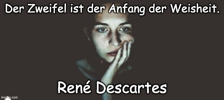 2. Descartes’ Methode: Descartes gab sich damit nicht zufrieden. Er beschloss, ‘alles’, was er zu wissen glaubte, radikal in Frage zu stellen.                                                                          3. Das Ziel: Er tat dies nicht, um zynisch zu werden, sondern um eine Grundlage zu finden, die „absolut sicher“ war, etwas, das nicht bezweifelt werden konnte.💡 Das Endergebnis: „Cogito, ergo sum.“ Descartes’ Zweifelprozess führte zu seiner berühmtesten Erkenntnis: Er konnte die Existenz der Welt, seine eigenen Sinne und sogar mathematische Wahrheiten bezweifeln. Das Paradoxon: Das Einzige, woran er nicht zweifeln konnte, war die Tatsache, dass er zweifelte. Die Schlussfolgerung: Wenn er zweifelte, dachte er. Und wenn er dachte, musste er existieren. Das Zitat: Dies führte zu dem legendären Ausspruch: „Cogito, ergo sum“ (Ich denke, also bin ich). Für Descartes war der Zweifel daher nicht das Ziel, sondern der unverzichtbare erste Schritt auf dem Weg zur unerschütterlichen Wahrheit. 🧠 Eine Anmerkung zur Selbstreflexion: Das Zitat des Bloggers Peter Ros: „War diese Aussage nun von Descartes oder von Aristoteles? Ich bezweifle es …“ Die Tatsache, dass wir sogar den Urheber der Aussage über den Zweifel bezweifeln, schließt den Kreis auf wunderbare Weise. Es ist ein perfektes Beispiel dafür, wie der Zweifel uns zwingt, tiefer nach der Wahrheit zu graben.
