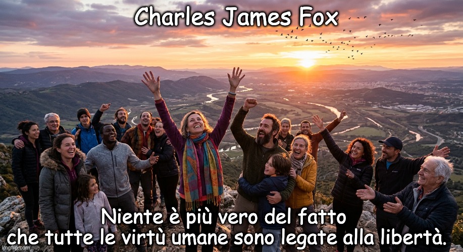 Immagine- Peter van Geest AI. Significato 📖: Questa è un’affermazione profonda riguardo al rapporto tra i valori umani e il bisogno fondamentale di libertà. L’affermazione “Nulla è più vero del fatto che tutte le virtù umane sono connesse alla libertà” significa che “ogni buona qualità o virtù” dell’uomo è profondamente connessa e dipendente dalla ‘libertà’. Virtù come l’onestà, il coraggio, la giustizia e la misericordia possono manifestarsi e prosperare pienamente solo in un ambiente in cui le persone sono libere di fare le proprie scelte. Una persona non libera, ad esempio oppressa, non ha la piena opportunità di praticare queste virtù. Ad esempio: Coraggio: Ci vuole libertà per essere coraggiosi e difendere ciò che è giusto, anche se ciò comporta dei rischi. Giustizia: Per agire giustamente, bisogna essere liberi di prendere le decisioni corrette e trattare gli altri con equità. Misericordia: Mostrare compassione e aiutare gli altri richiede la libertà di fare scelte basate sulla compassione. In breve, l’affermazione suggerisce che la libertà è il fondamento su cui si possono costruire tutte le altre virtù e che senza libertà, le virtù possono essere limitate o addirittura impossibili. 🌍 Autore: Questa affermazione è spesso attribuita a Charles James Fox, un importante statista e politico britannico della fine del XVIII e dell’inizio del XIX secolo. Era noto per la sua difesa delle libertà civili e la sua opposizione alla schiavitù. Sebbene la citazione non sia stata trovata direttamente nei suoi scritti o discorsi, è generalmente accettato che catturi l’essenza della sua filosofia politica e la sua convinzione sull’importanza della libertà. 💡 Perché questa citazione è importante: Questa citazione ci ricorda che la libertà non è solo un diritto umano fondamentale, ma anche un prerequisito cruciale per sviluppare ed esprimere le nostre migliori qualità. Sottolinea la necessità di custodire e difendere la libertà, non solo per noi stessi ma anche per gli altri, perché è la chiave per una società giusta e umana. In un mondo in cui le libertà sono spesso minacciate, questa citazione è un potente promemoria dell’importanza di lottare per la libertà per tutti. Ci motiva a difendere i nostri diritti e a combattere l’oppressione e l’ingiustizia.