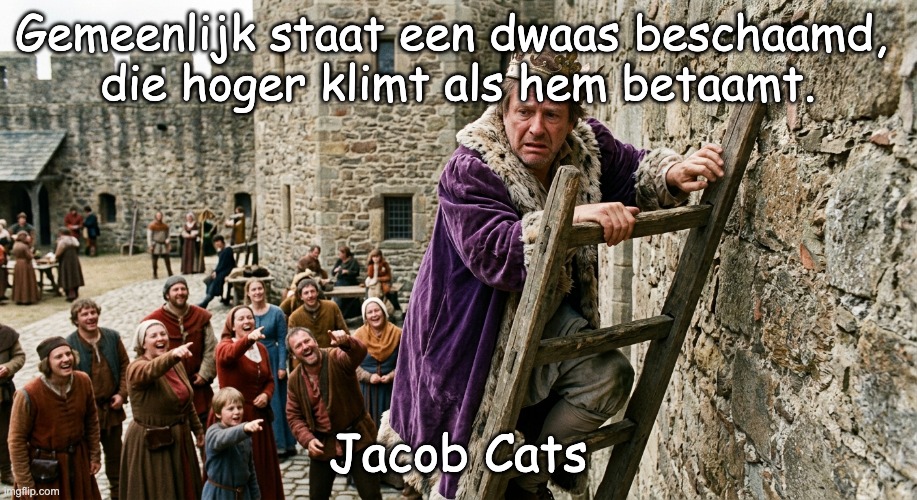 Moderne vertaling van de woorden: Gemeenlijk: Gewoonlijk, meestal. Beschaamd: Beschaamd, te schande gezet. Betaamt: Passend is, fatsoenlijk is (gezien zijn/haar stand of kunde). 🎨 Oorsprong en Context: De oorsprong van dit specifieke gezegde ligt in de rijke Nederlandse traditie van ‘embleemliteratuur’ en moralistische poëzie uit de 17e eeuw (de Gouden Eeuw). Emblemata: In die tijd waren boeken met ‘emblemen’ (afbeeldingen met een moraliserend gedichtje erbij) zeer populair. Ze dienden om de lezer levenswijsheid en morele lessen bij te brengen. Thema: Het thema van de “klimmer” die gestraft wordt voor zijn arrogantie was een zeer geliefd onderwerp in deze conservatieve samenleving, waar men vond dat iedereen zijn ‘plaats’ moest kennen. ✍️ Auteur:  De auteur van dit specifieke gezegde is de beroemde Nederlandse dichter en staatsman Jacob Cats (1577–1660). “Vader Cats”: Vanwege zijn toegankelijke, moralistische en vaak volkse poëzie werd hij liefkozend “Vader Cats” genoemd. Zijn werken stonden in die tijd in bijna elk Nederlands huishouden, vaak naast de Bijbel. Bron: Dit gezegde komt waarschijnlijk uit een van zijn bekendste werken, zoals ‘Spiegel van den Ouden ende Nieuwen Tijdt’ (1632), waarin hij talloze spreekwoorden en zinsneden verzamelde en toelichtte. Hoewel de taal verouderd is, blijft de psychologische waarheid erachter tijdloos: Statusdrang: Mensen proberen nog steeds vaak een status te veinzen (bijvoorbeeld op sociale media) die ze niet werkelijk hebben. Ontmaskering: Wanneer de realiteit de schijn inhaalt (de “dwaas valt”), volgt er vaak publieke kritiek of schaamte.