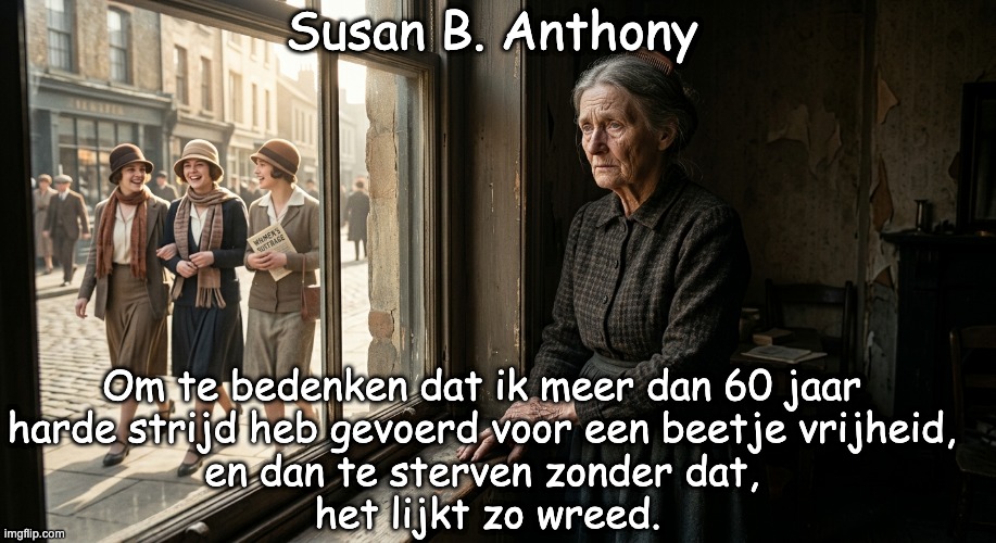 Afbeelding: Peter van Geest AI. Betekenis: Het gezegde drukt ‘bitterheid, verdriet en frustratie’ uit. De kern is: iemand heeft ‘meer dan zestig jaar gestreden voor vrijheid of gelijke rechten’, maar dreigt te ‘sterven zonder het resultaat zelf nog mee te maken’. In de context van Susan B. Anthony gaat het vrijwel zeker om ‘vrouwenrechten’, vooral het vrouwenkiesrecht. Oorsprong: De uitspraak wordt meestal verbonden met de ‘late levensjaren van Susan B. Anthony’. Zij had ‘decennialang’ gestreden voor vrouwenkiesrecht, maar stierf in 1906. Het nationale vrouwenkiesrecht in de Verenigde Staten kwam pas in 1920 met het 19e amendement. De gedachte achter het citaat past dus heel goed bij haar situatie. Toch is de ‘exacte formulering niet goed gedocumenteerd in een primaire bron’ en lijkt zij waarschijnlijk een ‘latere parafrase of overlevering’.Auteur: Het gezegde wordt vaak aan Susan B. Anthony toegeschreven. Als ‘idee of sentiment’ is dat waarschijnlijk terecht. Als ‘letterlijk citaat’ is de toeschrijving ‘onzeker’. De veiligste formulering is daarom: “toegeschreven aan Susan B. Anthony” of: “waarschijnlijk een parafrase van Susan B. Anthony’s gevoelens”.